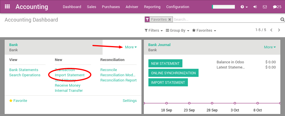 Once you have installed this feature, you can setup your bank account to allow importing bank statement files. To do this, go to the accounting Dashboard, and click on the More button of the bank account. Then, click on Import Statement to load your first OFX file.