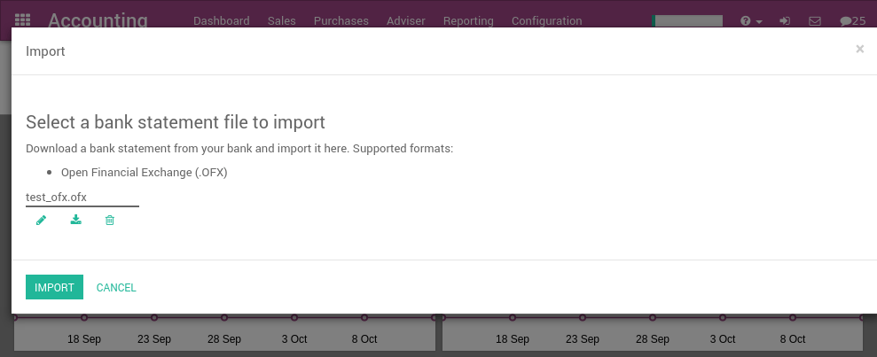 In order to import OFX statements, you need to activate the feature in Odoo. In the Accounting application, go to the menu . From the accounting settings, check the bank statements option Import in .OFX Format and apply.