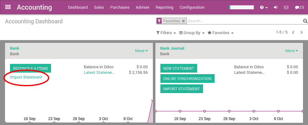 After having imported your first file, the Odoo accounting dashboard will automatically propose you to import more files for your bank. For the next import, you don’t need to go to the More menu anymore, you can directly click on the link Import Statement.