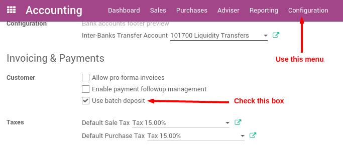 To verify that the Batch Deposit feature is installed, go to the menu of the accounting application. Check the feature: Allow batch deposit.