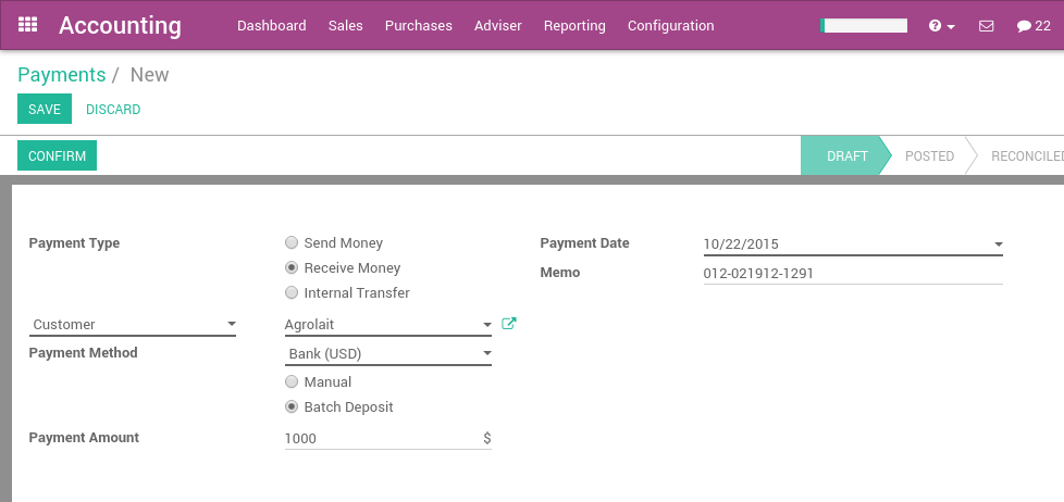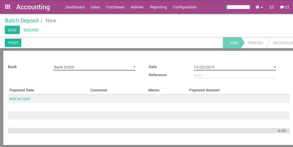 From the Accounting application, go to the menu , and create a new Batch Deposit.