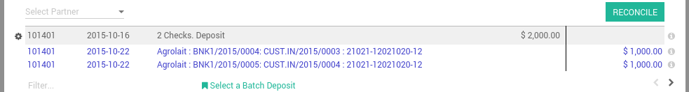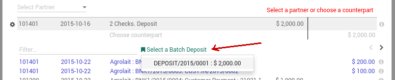 If you select a batch deposit, Odoo will automatically fills all the checks contained in this deposit for the matching. (2 checks were in this batch deposit the example below)