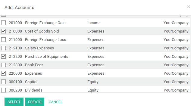 Repeat this steps to create a revenue budgetary position. Only in this case select the relevant income accounts.