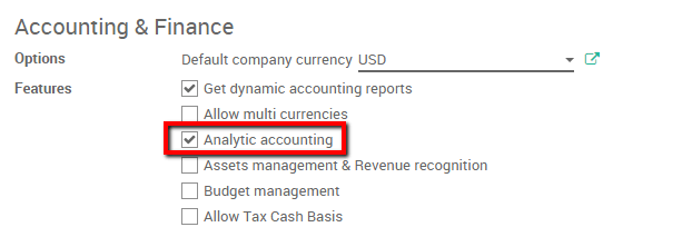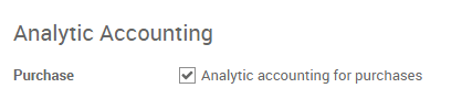 Next step is to activate the analytical accounting. In the accounting app, select Configuration ‣ Settings and thick the Analytic accounting box.