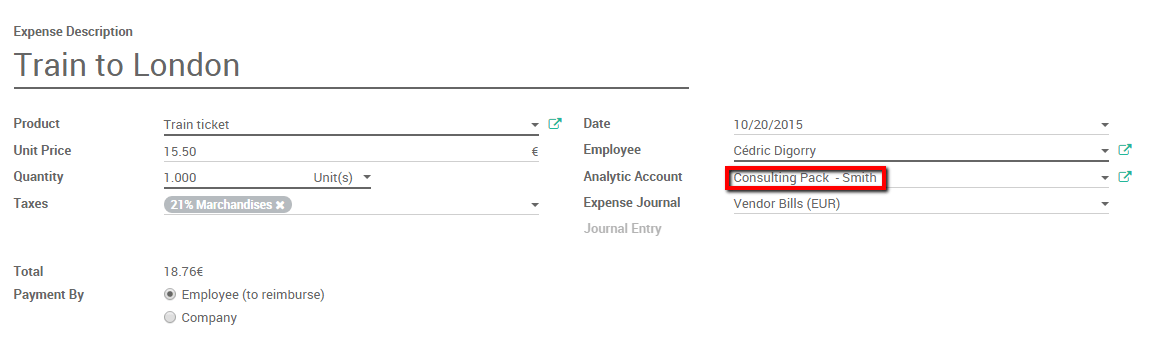 Enter the Expense module, click on My expenses ‣ Create. Select the Train ticket product and link it to the analytical account discussed above.