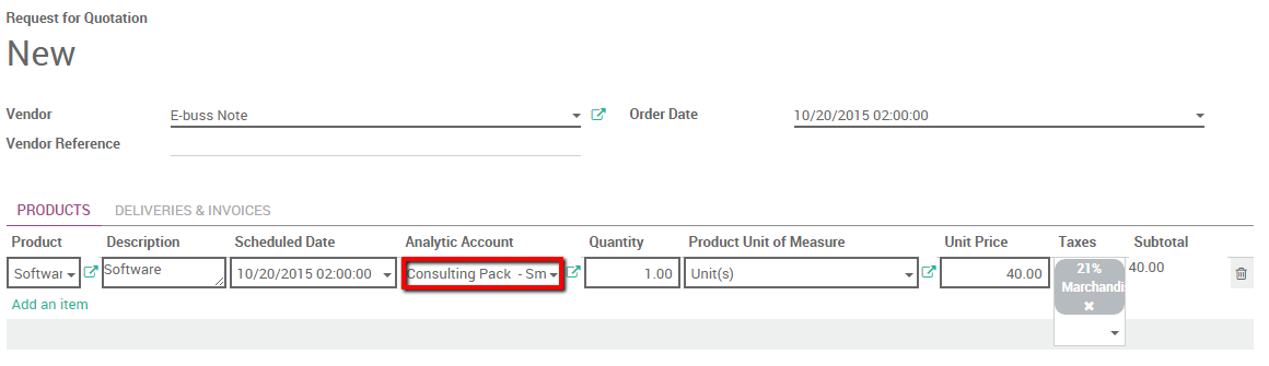 We also need to buy a software for our customers. In the purchase app create a purchase order for the software product. (please refer to the following document: From purchase order to invoice and receptions). Within the line we can link the product’s cost with the analytical account. Specify the order line and select the correct analytical account. Confirm the sale.