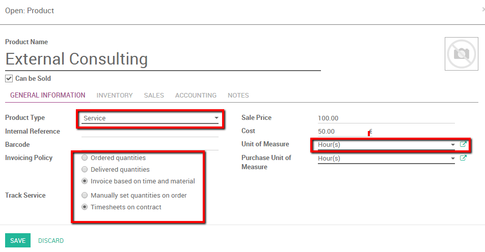 We thus need to create a sales order with a service product invoiced based on time and material and tracked by timesheets with hours as unit of measures.