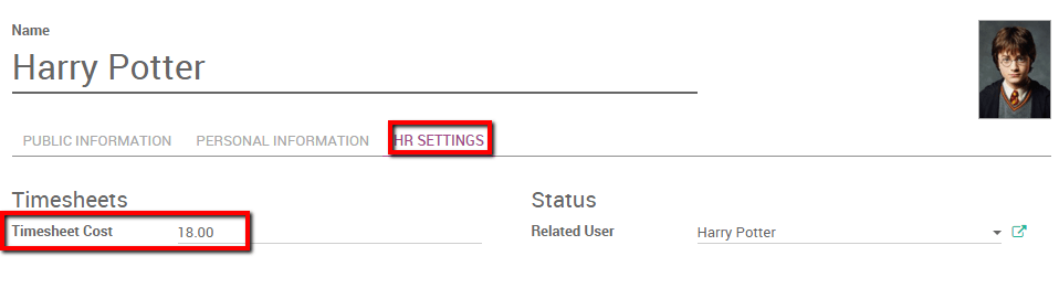 On the employee sheet enter the HR settings tab. Here you are able to specify the Timesheet Cost of your employee. In this case Harry has a cost of 18 euros / hours. We will thus fill in 18 in this field.