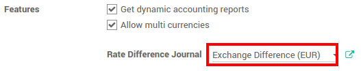 The Rate Difference Journal records the differences between the payment registration and the expected amount. For example, if a payment is paid 1 month after the invoice was issued, the exchange rate has probably changed. The fluctuation implies some loss or profit that are recorded by Odoo.