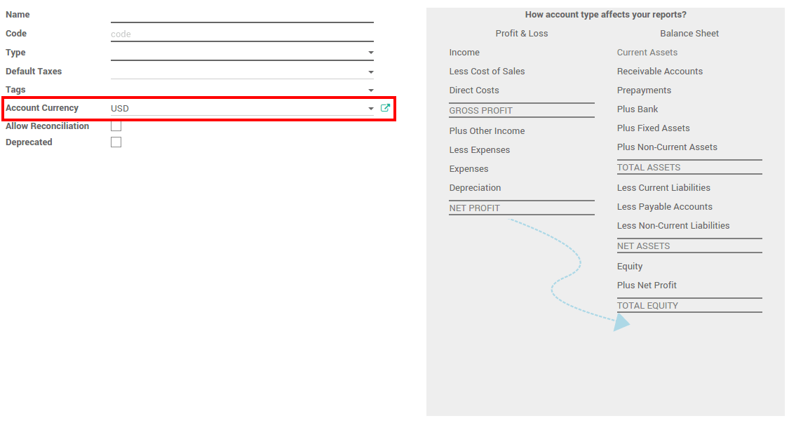 Choosing to use the multi-currency option in Odoo will allow you to send sales invoices, quotes and purchase orders or receive bills and payments in currencies other than your own. With multi-currency, you can also set up bank accounts in other currencies and run reports on your foreign currency activities.