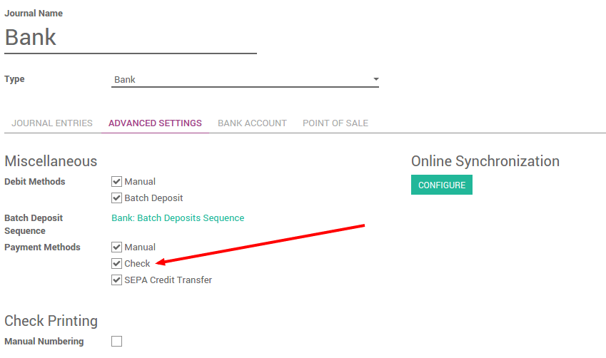 In order to allow payments by checks, you must activate the payment method on related bank journals. From the accounting dashboard (the screen you get when you enter the accounting application), click on your bank account on option. On the Payment Method field, set Check.