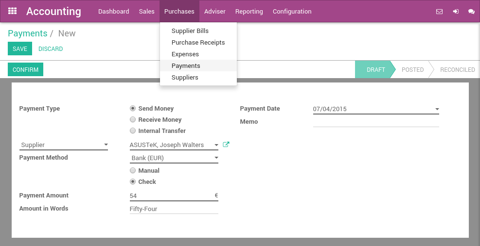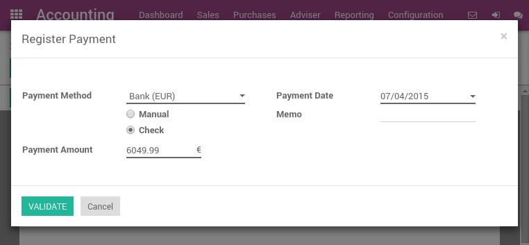 To register a payment on a bill, open any supplier bill from the menu . Once the supplier bill is validated, you can register a payment. Set the Payment Method to Check and validate the payment dialog.