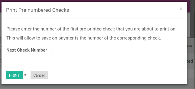 If you want to review every payment one by one before printing the check, open on the payment and click on Print Check if you accept it. A dialog will ask you the number of the check. It automatically proposes you the next number, but you can change it if it does not match your next check number.