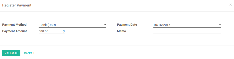 We will now record a payment for one bill only. Open the bill, then click on Register Payment. Insert the Payment Method, Date and Amount, and click on Validate.