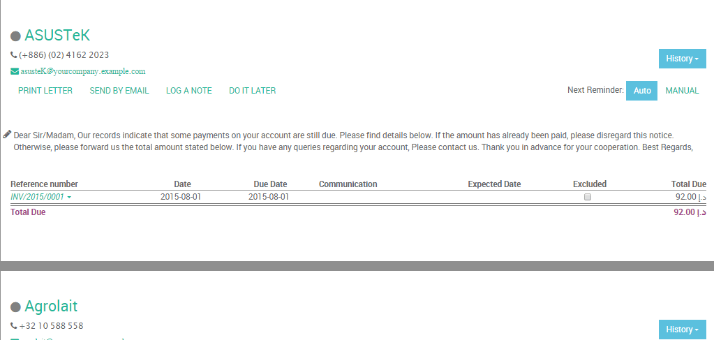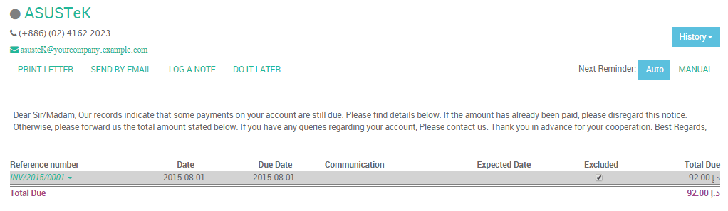 - Plan the next reminder (but it’s better to keep in automatic mode so that Odoo will stick to the follow-up plan of the company)