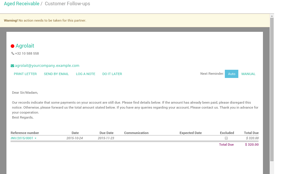 Once everything is setup, Odoo will prepare follow-up letters and emails automatically for you. All you have to do is to the menu in the accounting application.