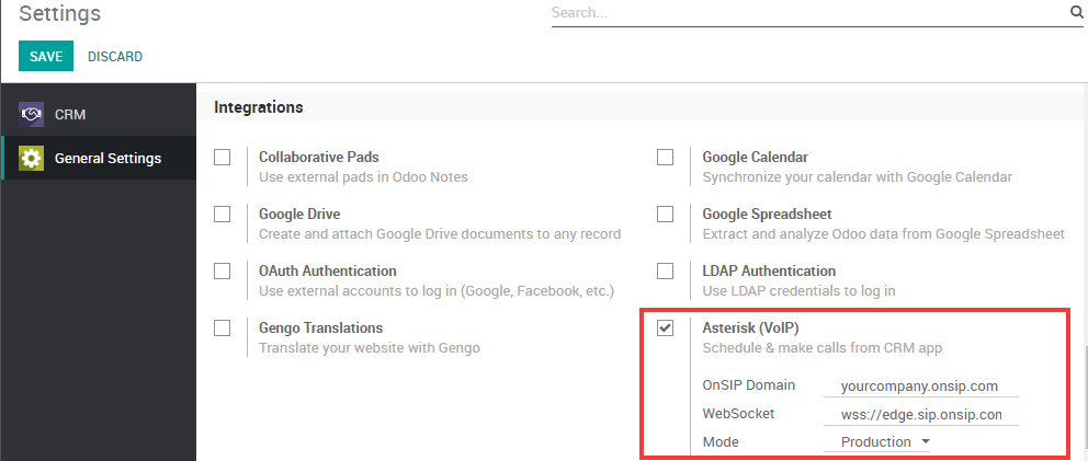 Go to Settings/General Settings. In the section Integrations/Asterisk (VoIP), fill in the 3 fields: