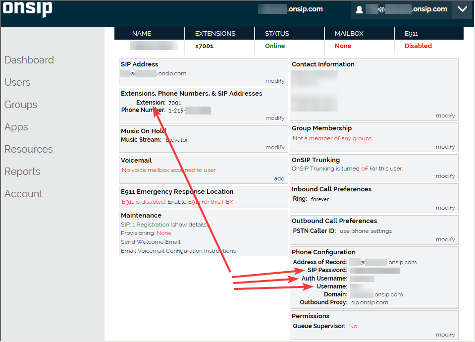 You can find all this information by logging in at https://admin.onsip.com/users, then select the user you want to configure and refer to the fields as pictured below.