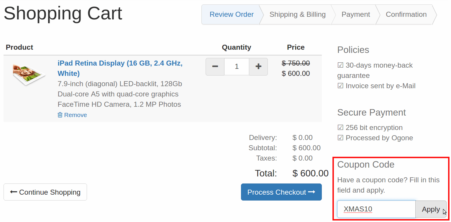 The promocode used by the customer is stored in the system so you can analyze the performance of your marketing campaigns.