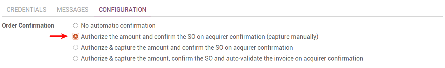With this mode, the order is confirmed but the amount is kept on hold. Once the delivery processed, you can capture the payment from Odoo. This mode is only available with Authorize.net.