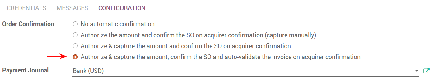 If you choose this mode you are requested to select a payment journal in order to record payments in your books. This payment is automatically reconcilied with the invoice, marking it as paid. Select your bank account if you get paid immediately on your bank account. If you don’t you can create a specific journal for the payment acquirer (type = Bank). That way, you can track online payments in an intermediary account of your books until you get paid into your bank account (see How to register credit card payments).