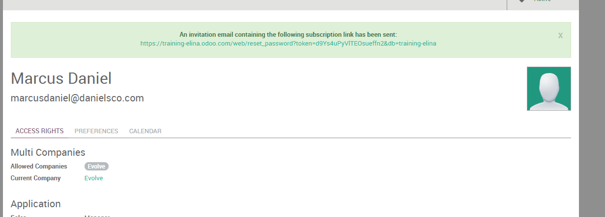From the Settings module, go to the submenu and click on CREATE. First add the name of your new user and the professional email address - the one he will use to log into Odoo instance - and a picture.
