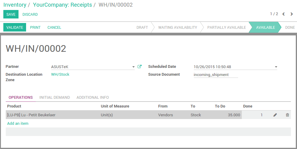 - On the opposite, a serial number is unique, and represented by only one barcode, sticked on only one item. This means that Odoo won’t accept scanning the same serial number more than once per operation.