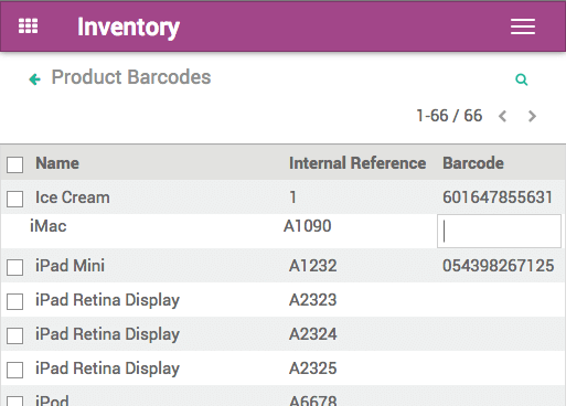 In order to fill a picking or to perform an inventory, you need to make sure that your products are encoded in Odoo along with their barcodes. If this is not already done, you can fill in the products barcodes through a handy interface. Go to and click . Click Save, and go back into the previous screen to click Configure Product Barcodes. This interface can also be accessed via the planner.