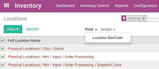 If you manage multiple locations, you will find useful to attribute a barcode to each location and stick it on the location. You can configure the locations barcodes in . There is button in the Print menu that you can use to print the locations names and barcodes. There are 4 barcodes per page, arranged in a way that is convenient to print on sticker paper.