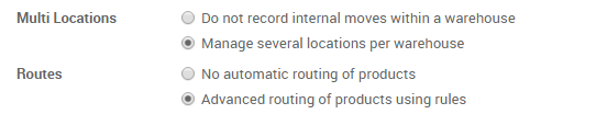 Under , activate the radio button Advanced routing of products using rules. Make sure that the option Manage several locations per warehouse is activated as well.