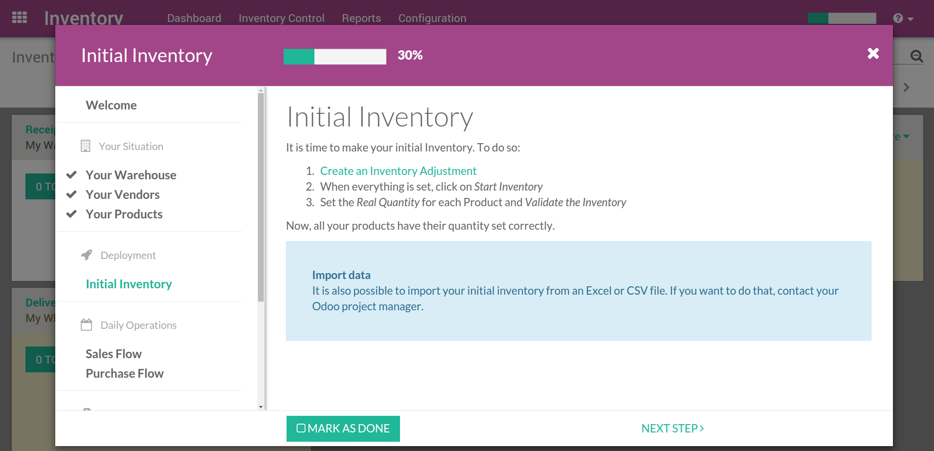 Once you have installed the Inventory application, click on the top-right progress bar to get access to the implementation guide.
