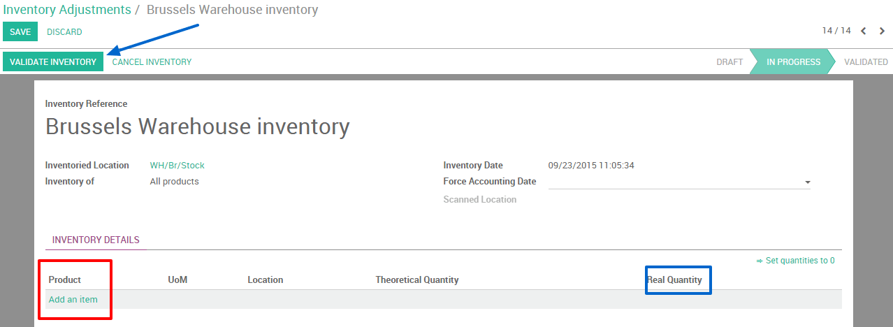 Go into the inventory application, select . You can then create a new inventory by clicking on Create. Fill in the Inventory Reference, Date and be sure to select the right warehouse and location.