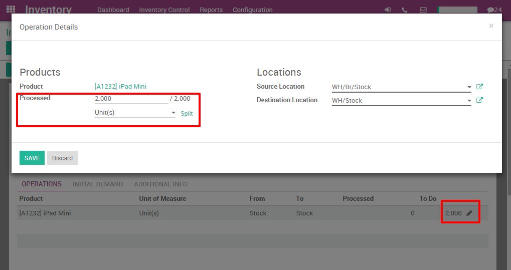 If you select Validate, Odoo will process all quantities to transfer.