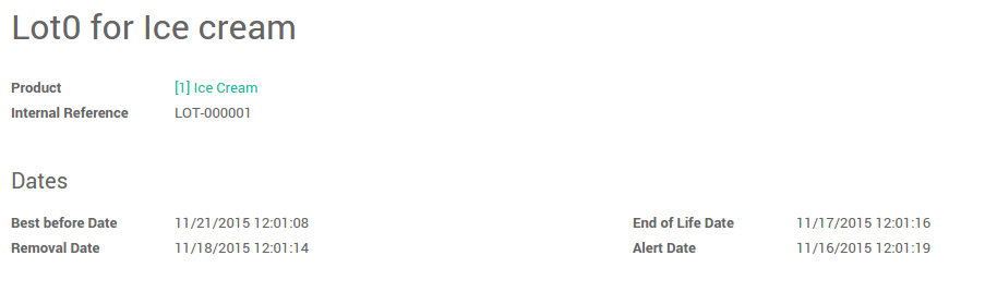 This will allow you to set four expiration fields for each lot or serial number: best before date, end of life date, alert date and removal date. These dates can be set from .