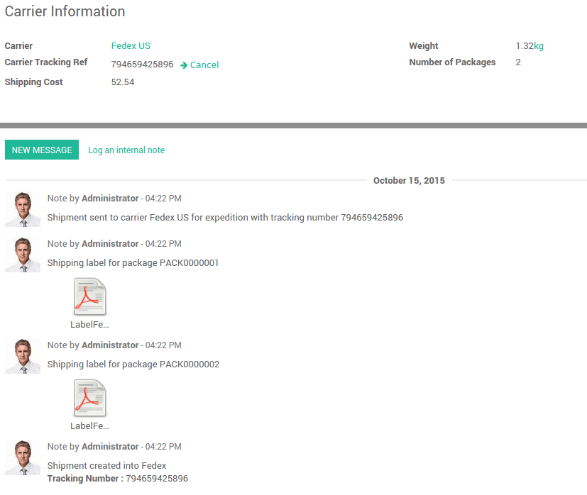 By default, Odoo considers that your delivery is composed of one package. But you can easily ship your deliveries with more than one package. It is fully integrated with the third-party shippers.