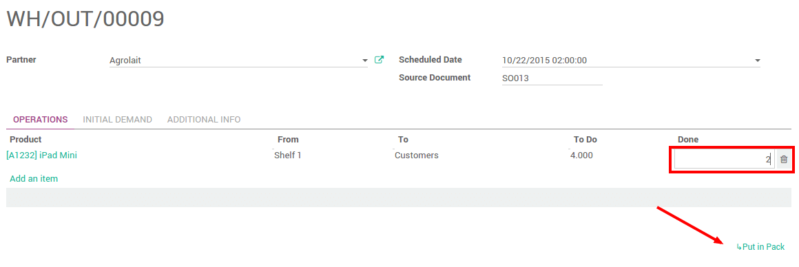 Choose the quantity you want to put in the first pack in the Done column, then click on the link Put in Pack.