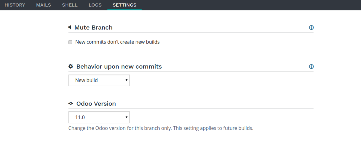 The production branch has no settings. It can’t be muted, will always update the existing production database and will run on the project’s version of Odoo. If you want to upgrade your production to a newer version please refer to the Upgrade section.
