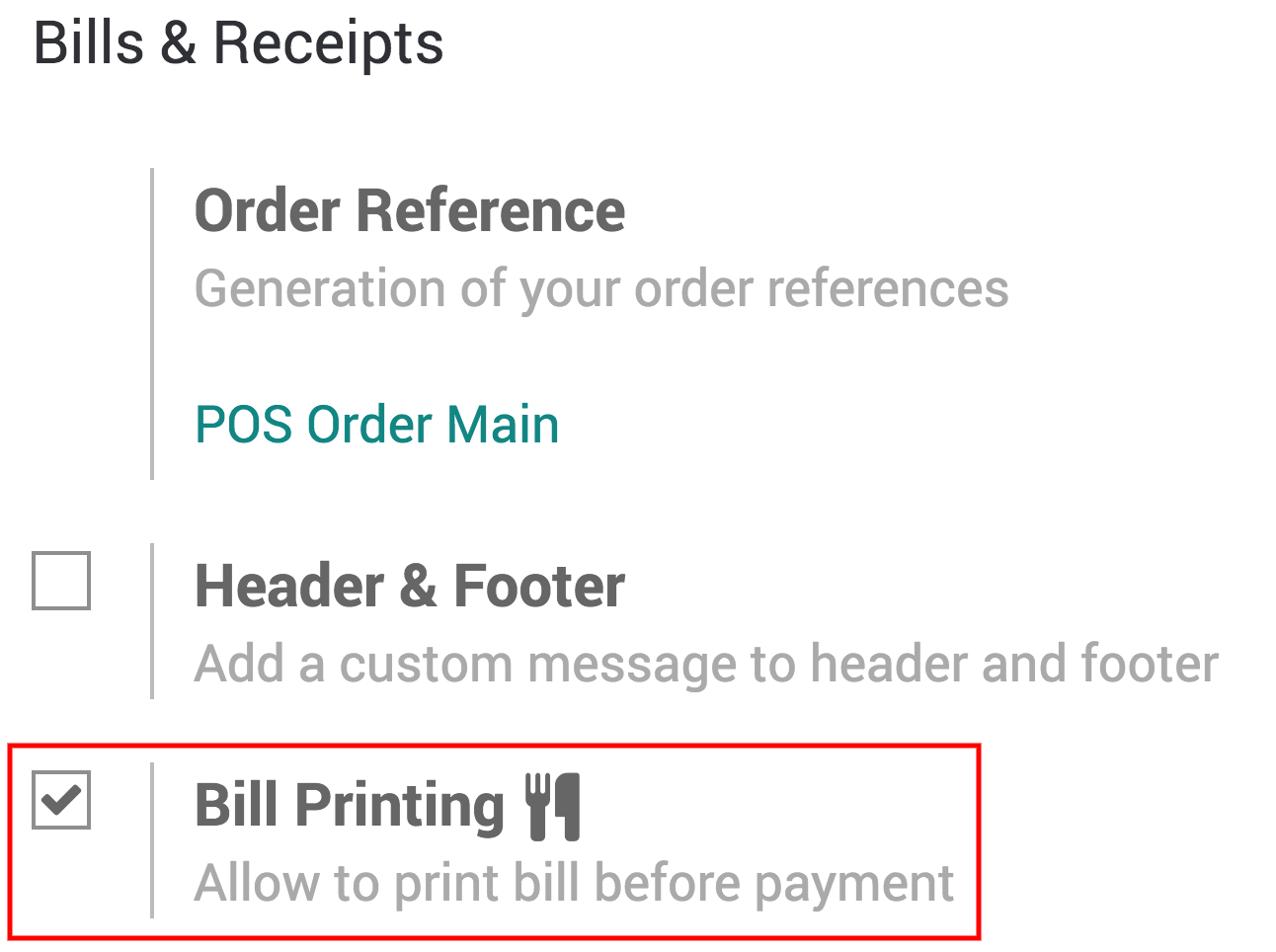 Under the Bills & Receipts category, you will find Bill Printing option.