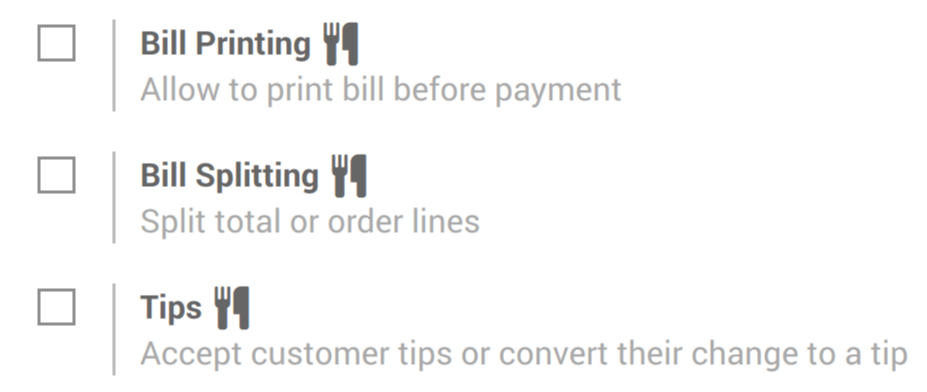 You now have various specific options to help you setup your point of sale. You can see those options have a small knife and fork logo next to them.