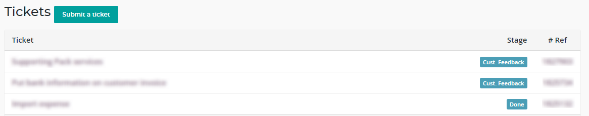 When you submit a ticket through Odoo Support a ticket will be created. Here you can find all the tickets that you have opened, the conversation between you and our Agents, the Status of the ticket and the ID (# Ref).