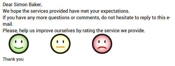 The customer just has to click on a smiley (Smile, Neutral or Sad) to assess your work. The customer can reply to the email to add more information. It will be added to the chatter of the task.