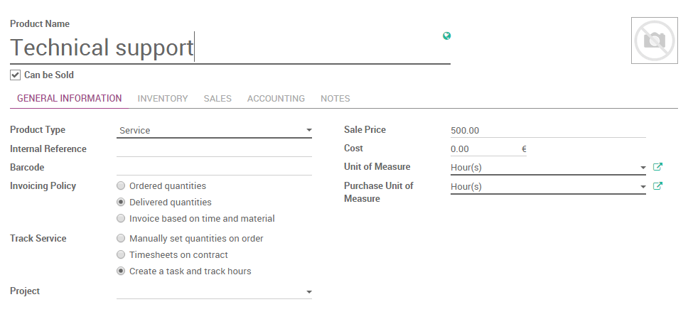 You need to configure your service on the product form itself in order to generate a task every time it will be sold. From the Sales module, use the menu and create a new product with the`following setup:
