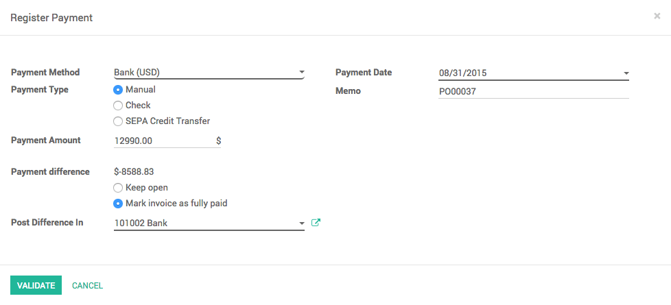 In the next page, click on Validate. The invoice is now registered in the system. Click on Register Payment, insert the detail of the payment, and click on Validate.