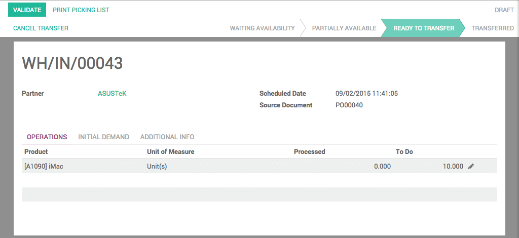 In the next page, check that the number of products received corresponds to the number ordered, then manually enter the delivered quantity and click on Validate.