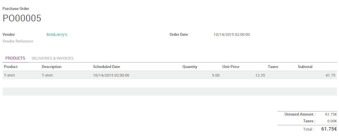 say that we issue a first purchase order to Bob&Jerry's for 5 t-shirts