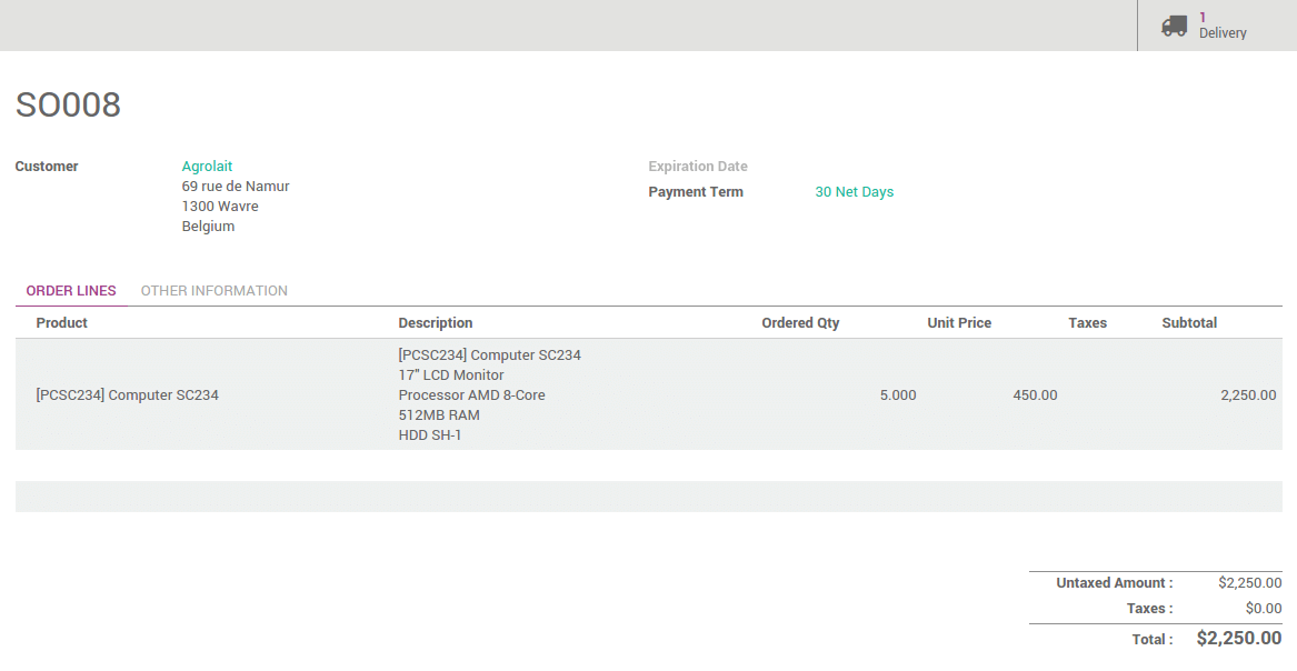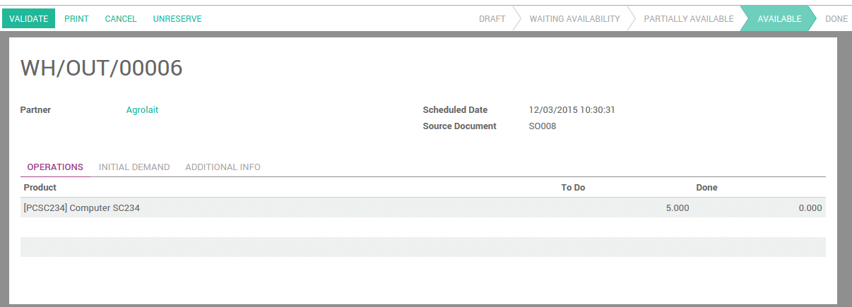 Click on the Delivery button to see the transfer order. The status of the outgoing shipment is Waiting Another Operation. It won’t be done until the purchase order is confirmed and received.