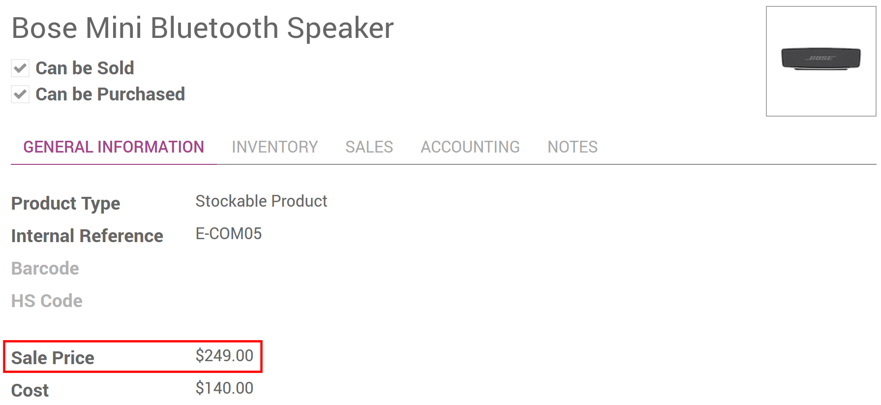 The public price is in your company’s main currency (see ) and is set in product detail form.