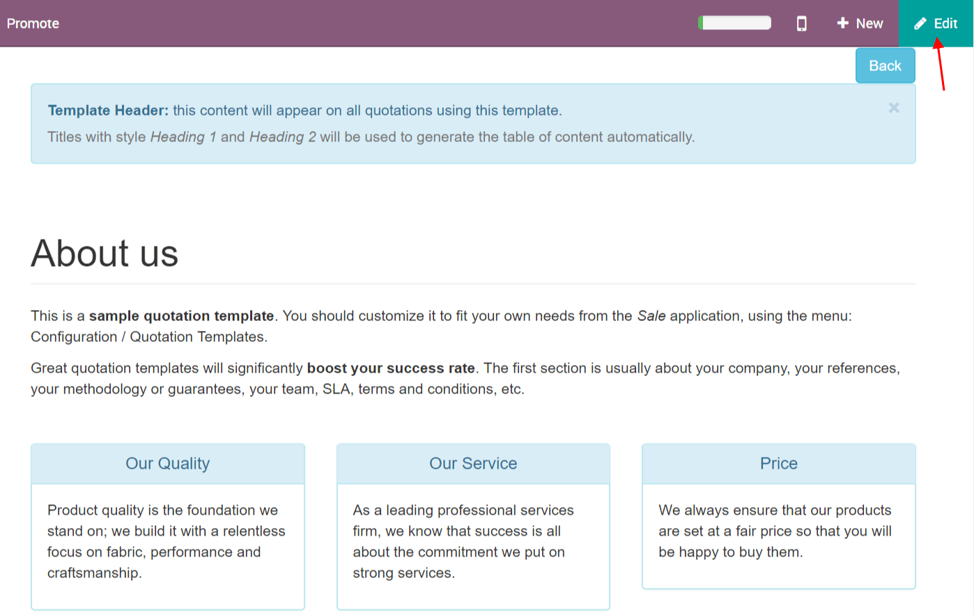 You can edit the customer interface of the template that they see to accept or pay the quotation. This lets you describe your company, services and products. When you click on Edit Template you will be brought to the quotation editor.